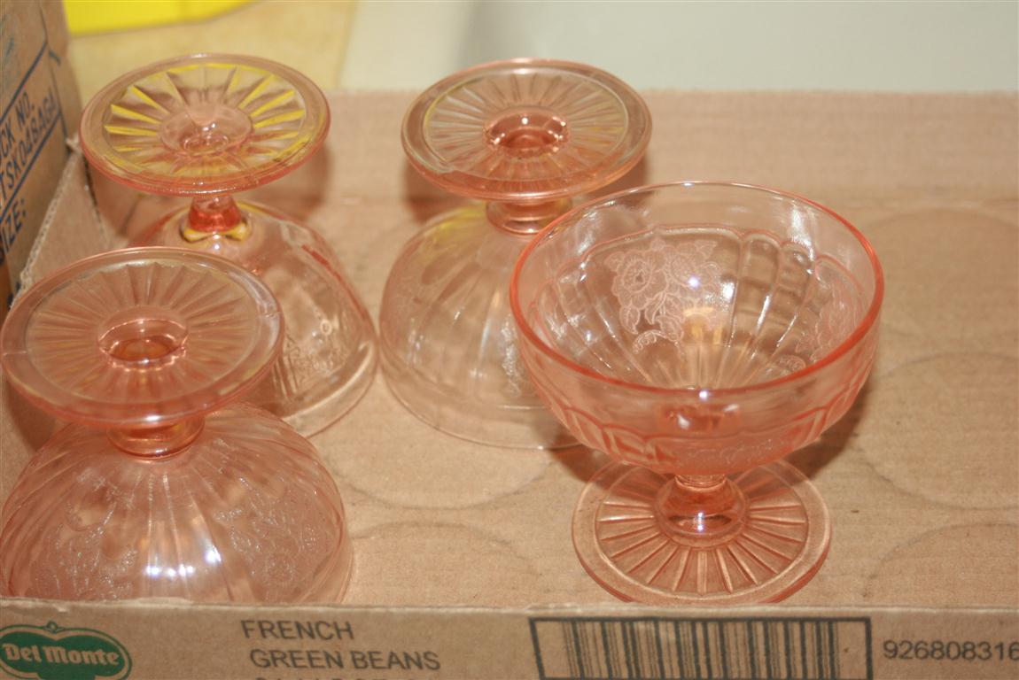 - 4 Pink Depression Sherbets, Lead Crystal Basket