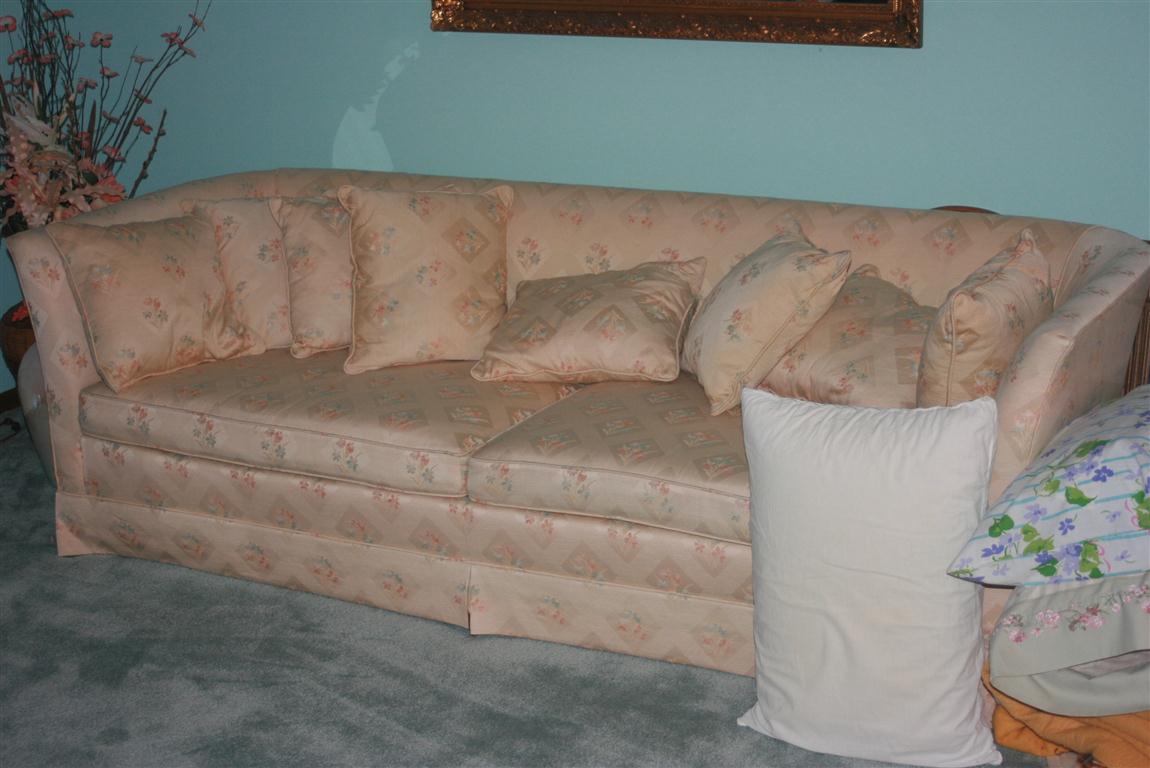 - Light Tan Sofa w/Pillow Back, 2 Peach Side Chairs